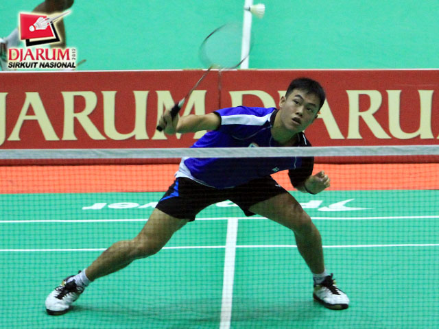 Yoga Sidik (Pelatprov DKI) sedang mengembalikan kok yang di oper oleh Reksy Aureza Megananda (Djarum Kudus).