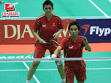 Vita Marissa yang berpasangan dengan Nadia Melati (Tangkas Specs) sedang melakukan serve untuk diberikan kepada pasangan Deariska Putri Medita / Ririn Amelia (Pelatnas).