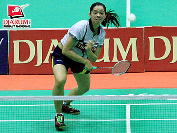 Febby Angguni A. (Djarum Kudus) sedang mengembalikan kok yang di oper oleh Onta dari Jepang.