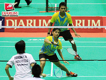 Rizki Yanu Kresnayandi yang berpasangan dengan Albert Saputra (Djarum Kudus) sedang mengembalikan kok yang di serve oleh pasangan Rendra Wijaya / Rian Sukmawan (Djarum Kudus).