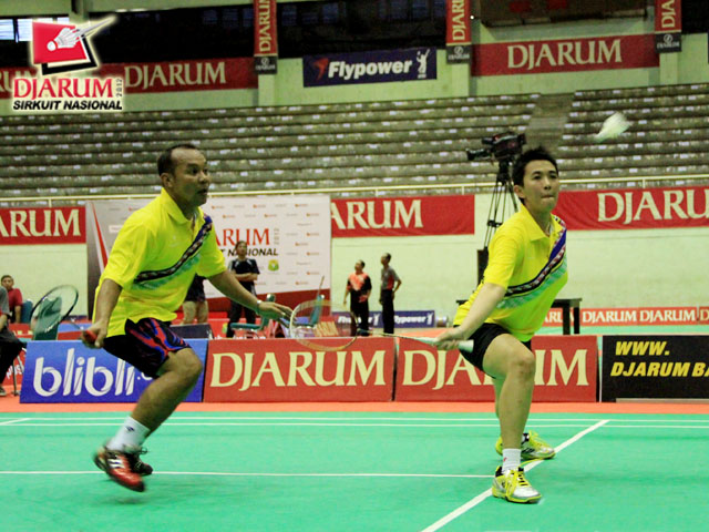 Rendra Wijaya yang berpasangan dengan Rian Sukmawan (Djarum Kudus) sedang memukul kok untuk dikembalikan kepada pasangan Albert Saputra / Rizki Yanu Kresnayandi (Djarum Kudus).