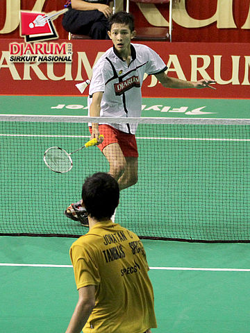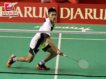 Jonathan Christie (Tangkas Specs) berusaha mengembalikan bola ke arah Bayu Pangisthu (PB Djarum Kudus).