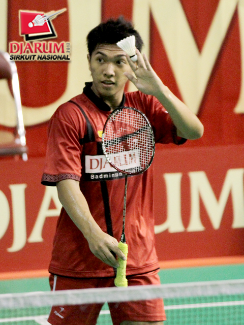 Rudi Cahyadi (PB Djarum Kudus) menyambut serve dari Gustaf Firdaus (Mutiara Bandung).
