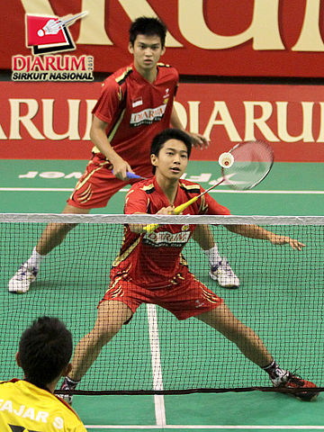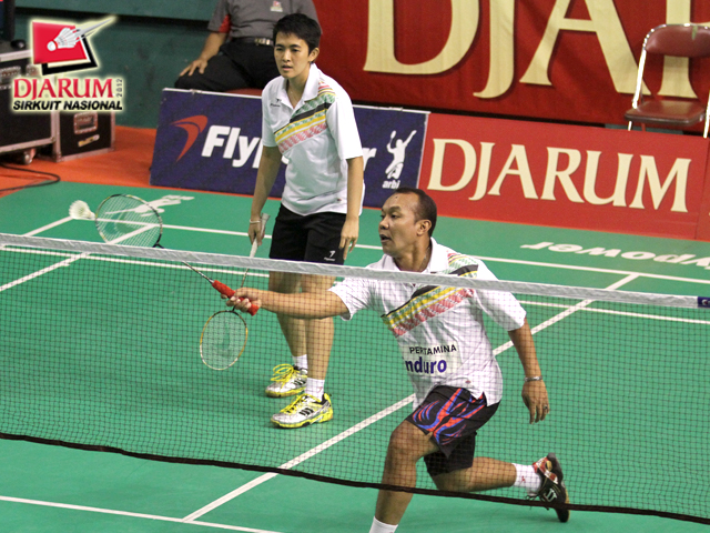 Bayu Pangisthu (PB Djarum Kudus) mengembalikan bola ke arah Ari Januari (Tangkas Specs).