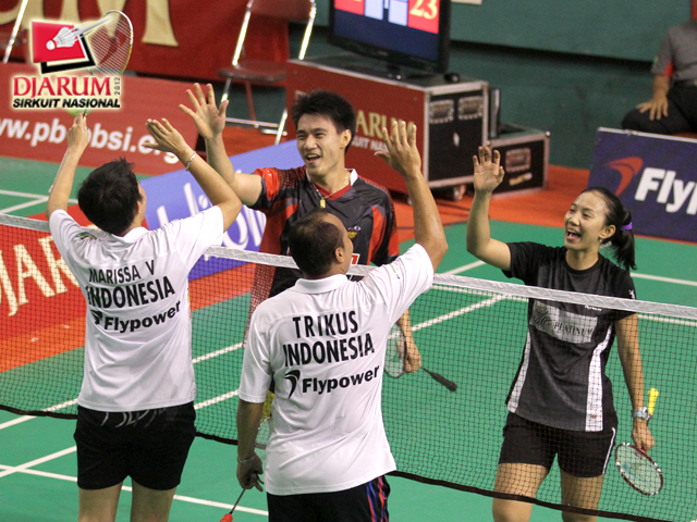 Pasangan ganda campuran dewasa, Trikus Harjanto/Vita Marissa (Pertamina Indonesia/Tangkas Specs) menyambut serve dari Rendra Wijaya/Devi Tika Permatasari (PB Djarum Kudus/SGS PLN).