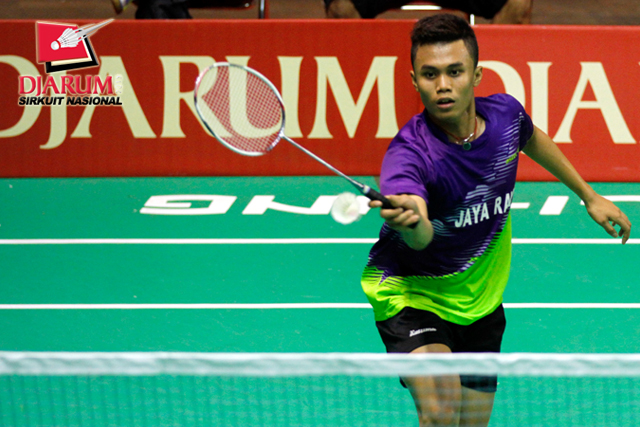 Eka Fajar (Jaya Raya) mengembalikan shuttlecock ke arah Krishna Adi (Jaya Raya Suryanaga).