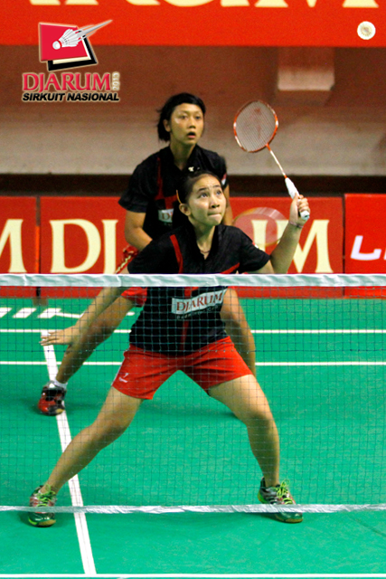 Mychelle Crhystine/Rofahadah Supriadi (PB Djarum) bersiap megembalikan shuttlecock ke arah Dianita Saraswati/Yulfira Barkah (Mutiara Bandung).