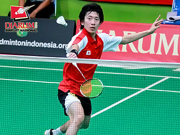 Hiraku Kobutoya (Hitachi Jepang) menyambut pengembalian kok yang dilepaskan Rafael Valentio (Hevindo).