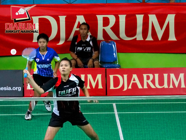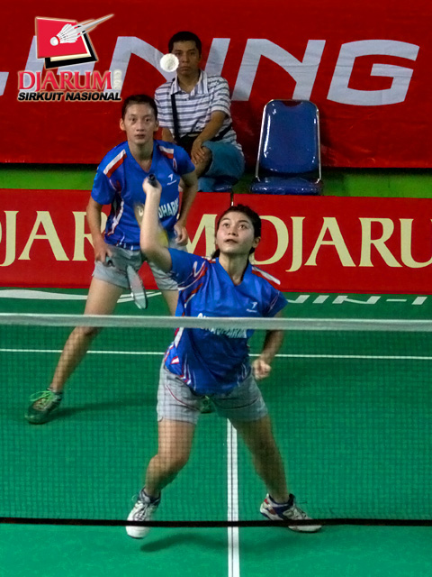 Mia Mawarti/Nuansa Giva (Guna Dharma) menyambar bola tanggung dari pasangan Melinda/Sharfina (Hi Qua Wima).