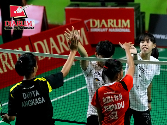 Lana Adriana/Maria Natalia (Ragunan/Focus) bersalaman dengan Anindita/Rizka (Angkasa Tarakan/Terpadu) usai bertanding.