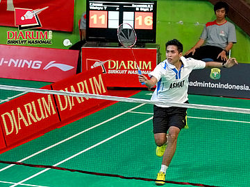 Indra Setiawan (Pertamina Indonesia) dengan tenang mengembalikan kok ke arah Andre Marteen (Mutiara Bandung).