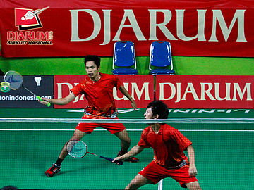 Yantoni Edi/Arsya Isnanu (PB Djarum) saat menyambut serve.