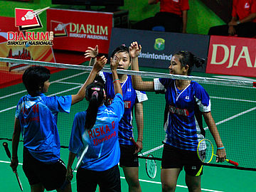 Febriani Endar/Ristya Ayu (PB Djarum) bersiap menyambar pengembalian tanggung dari Fisita/Puteri (Hi Qua Wima/Surya Baja).