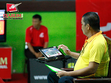 Abu Bakar/Tedi Supriadi (PB Djarum) menyambut serve dari Eduardo/Satelit Nanda (Tangkas Specs).