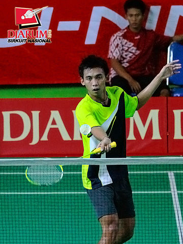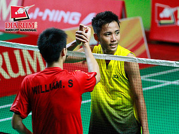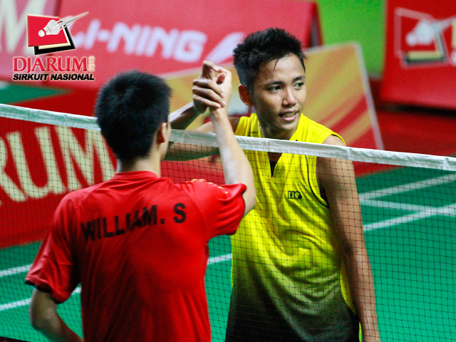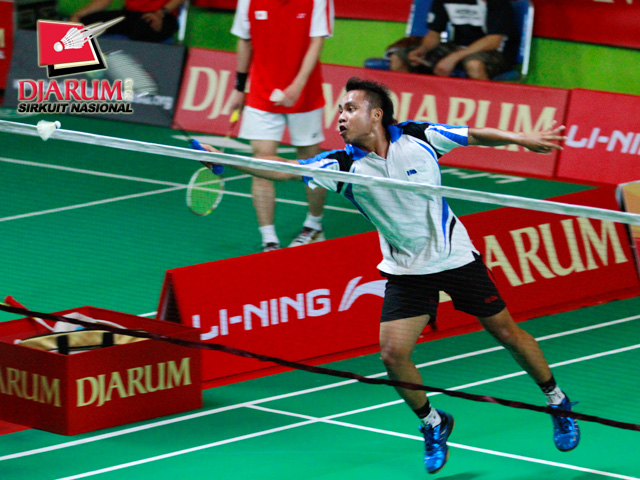 Ryan Fajar (PB Djarum) berusaha mengembalikan kok ke arah Hardianto (Tangkas Specs).