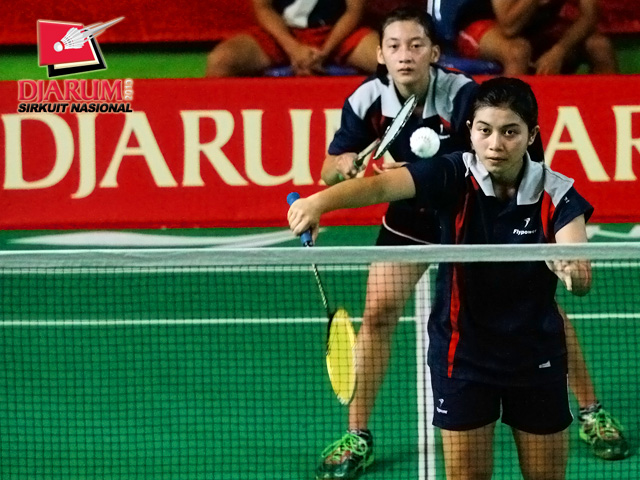 Pasangan ganda putri taruna PB Djarum Della Agustia/Ravenska Cintya mengembalikan kok ke arah Ervine Felicia/Tays Rona (Jaya Raya Suryanaga).