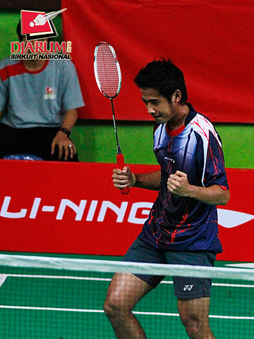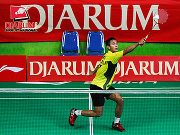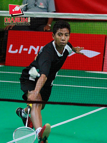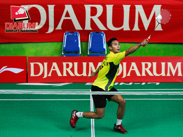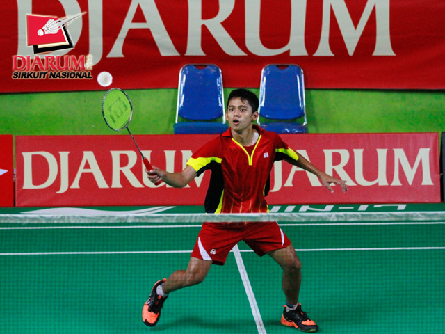 Kho Henrikho (PB Djarum) menyambut serve dari Alamsyah Yunus (Pertamina Indonesia).
