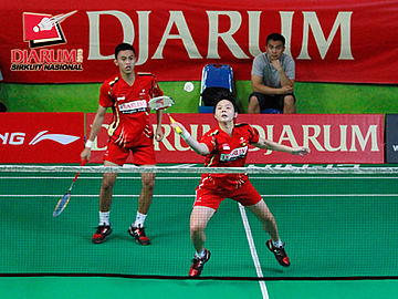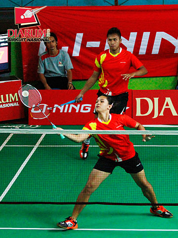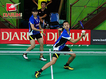 Tedi Supriadi/Della Agustia (PB Djarum) bersiap menyambar pengembalian tanggung dari Fajar Alfian/Inten Ratnasari (SGS PLN).