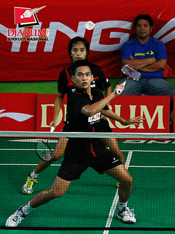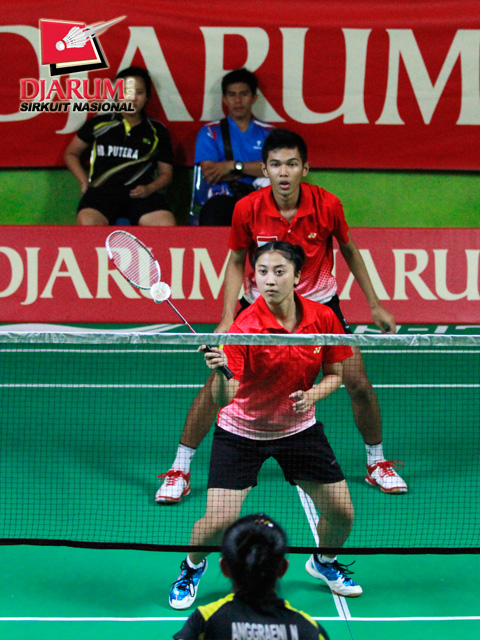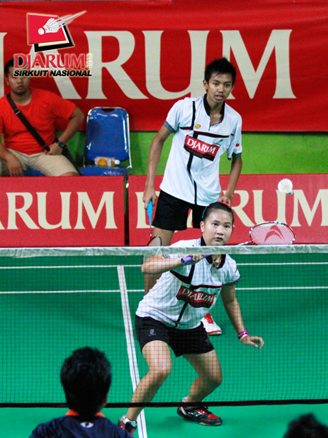Abu Bakar/Febriani Endar (PB djarum) bersiap menyambar pengembalian tanggung dari Alfian Sanganji/Clara Titi (Pusdiklat Jaya Raya).