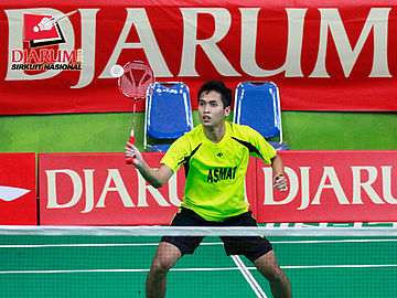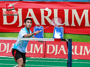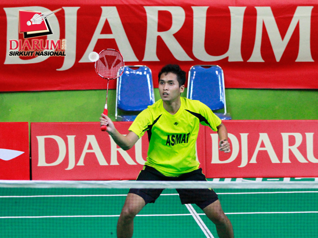 Bandar Sigit Pamungkas (Sarwendah) bersiap mengembalikan kok ke arah Senatria Agus (SGS PLN).