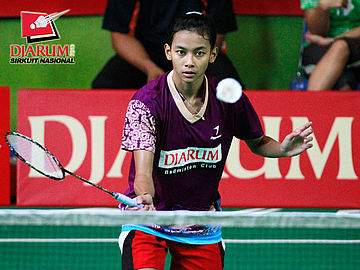 Dinar Dyah (PB Djarum) bersiap mengembalikan kok ke arah Elizabeth Purwaningthias (SGS PLN).