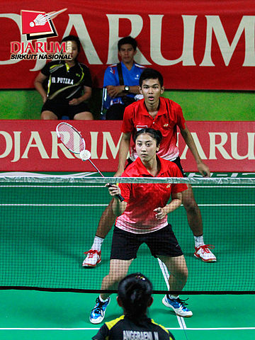 Andika Ramadiansyah/Thalia Clara (PB Djarum) mengembalikan kok ke arah pasangan Komandani Maytri/Anggie (Jata Raya Suryanaga/Ragunan).