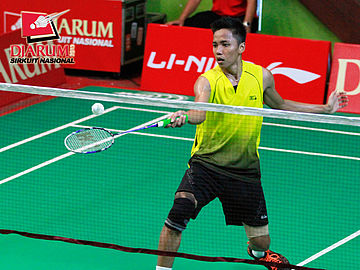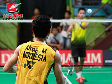 Febrian Irvanaldi (Hi Qua Wima) berusaha mengembalikan kok ke arah Andre Mateen (Mutiara Bandung).