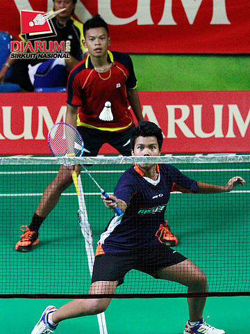 Komandani Maytri/Anggie (Jaya Raya Suryanaga/Ragunan) mengembalikan kok ke arah pasangan Andika Ramadiansyah/Thalia Clara (PB Djarum).