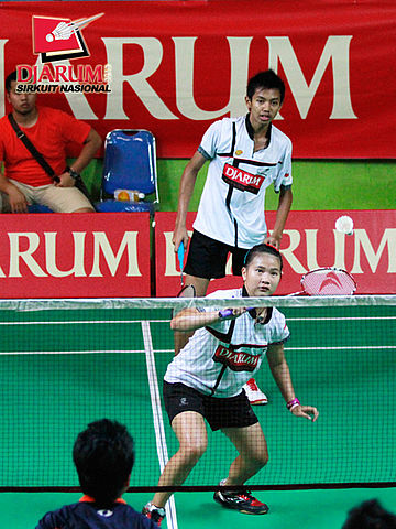 Fajar Alfian/Inten Ratnasari (SGS PLN) menyambut serve dari pasangan Stevan/Novalita (Mutiara Bandung).