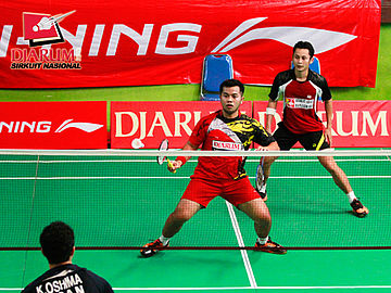 Rendra Wijaya/Rian Sukmawan (Musica Champion) menyambar pengembalian tanggung dari Hidayat Setiawan/Joko Aji (Tangkas Specs).