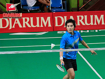 Putri Sekartaji (Mutiara Bandung) berusaha menggembalikan kok ke arah Arinda Sari (PB Djarum).