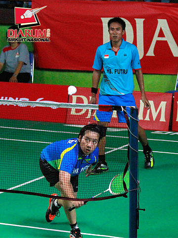 Dwi Setiawan/Lita Nurlita (Tsunami/SGS PLN) mengembalikan kok ke arah pasangan Ahmad Rivai/Anis Budihartini (Bank Sumsel/Pusdiklat Jaya Raya).
