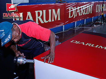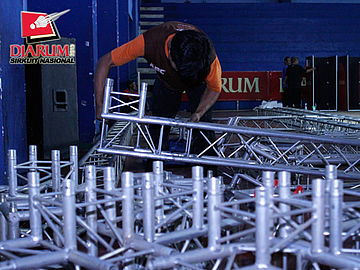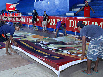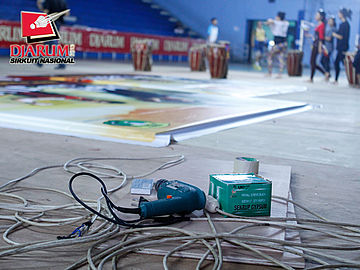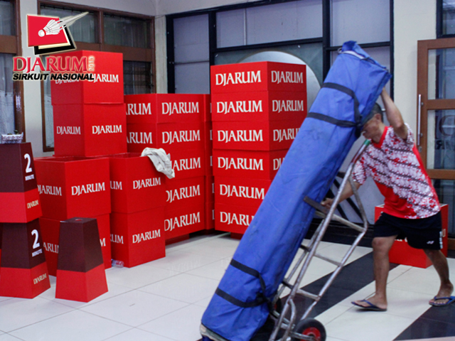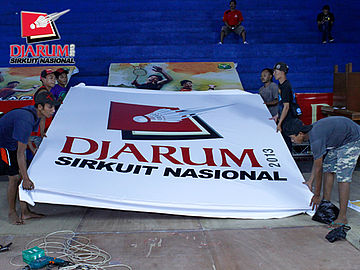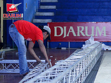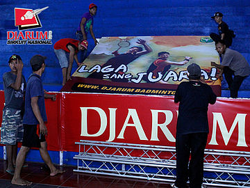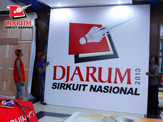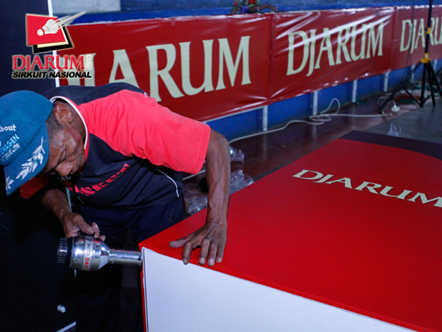 Dua pekerja saat menggotong banner Djarum Sirkuit Nasional 2013.