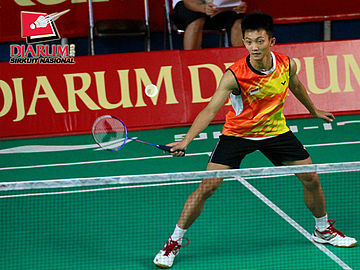 Febrian Irvanaldi (Hi Qua Wima) mengembalikan kok ke arah Gary Lam (Exist).