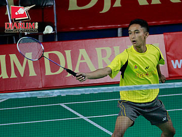 Topas Wismoyo (SGS PLN) mengembalikan kok ke arah M. Bayu Pangistu (Pelatnas).