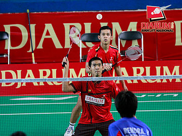 Jeka Wiratama/Vicky Rizky (PB Djarum) bersiap menyambut pengemalian dari pasangan Rendra/Ziro Wilmar (Rajawali Terang).