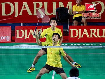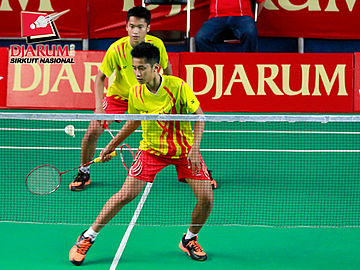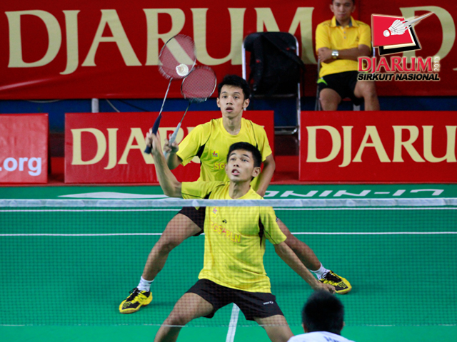Budiman Faza/Fajar Alfian (SGS PLN) bersiap menyambar pengembalian dari Angger Sudrajad/Satrya Aditha (PB Djarum).