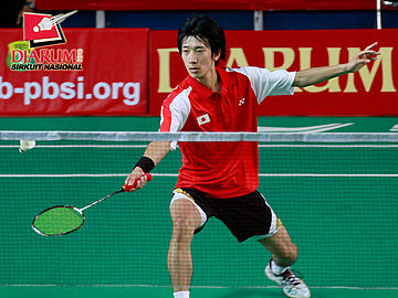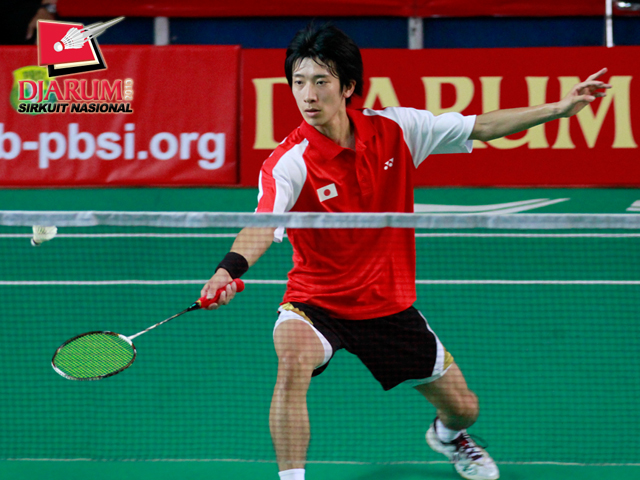 Hikaru Kabutoya (Hitachi Jepang) bersiap mengembalikan kok ke arah Ibang Eka (Indocafe Medan).