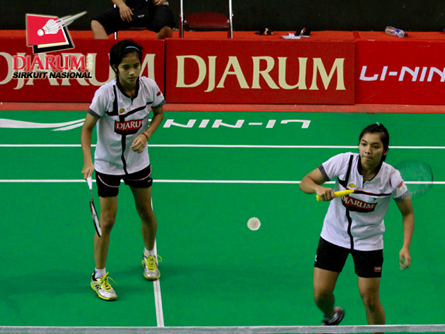Febriani Endar Kusumawati/Ristya Ayu Nugraheni (Djarum Kudus) mengembalikan kok ke arah Novi Darmayanti/Widya Tiffani (Candra Wijaya/Tangkas Specs).