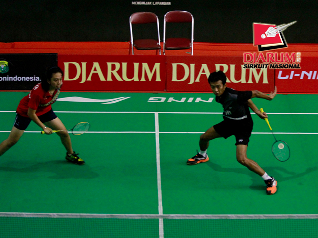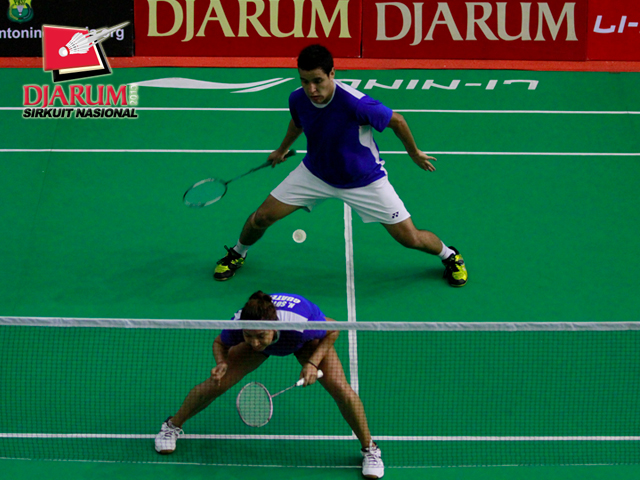 Adriansyah Putra/Devi Tika Permatasari (Pertamina Indonesia/SGS PLN) bersiap mengembalikan smash dari Bambang Saefulloh/Mia Kurnia H (SGS PLN).