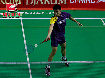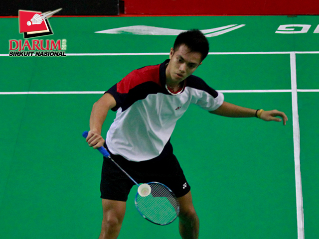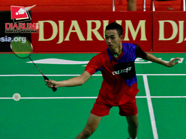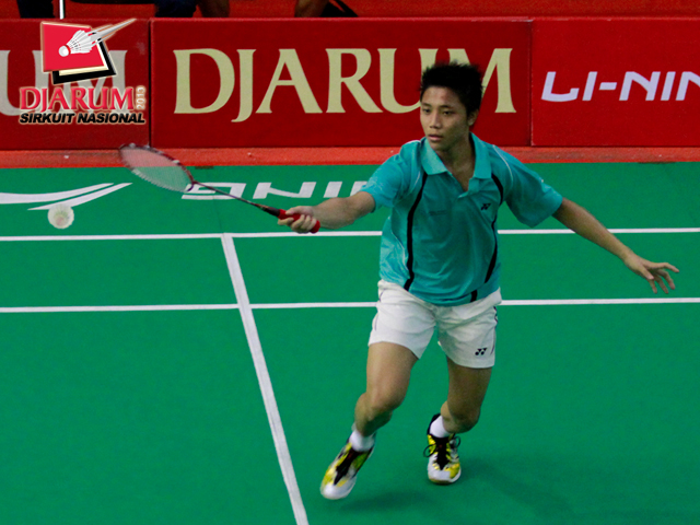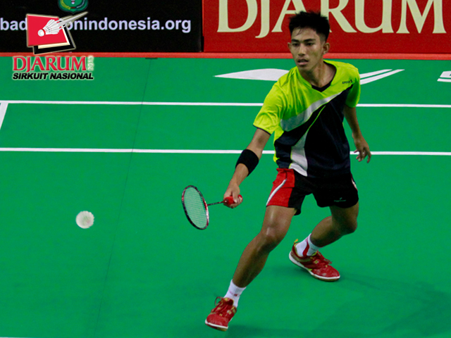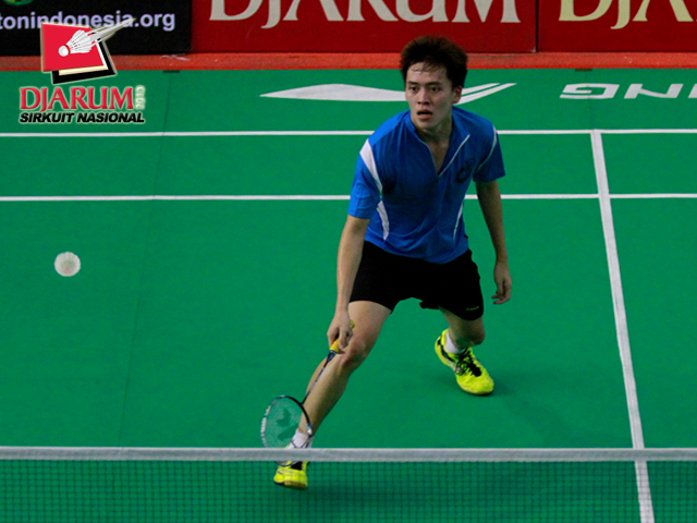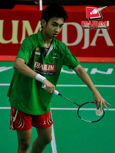 Moch Revindra (Djarum Kudus) melakukan serve.
