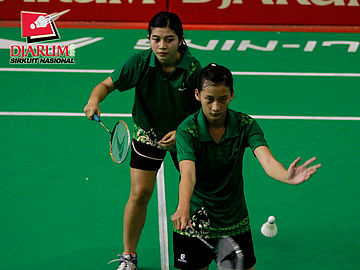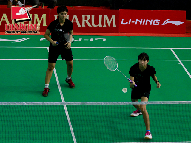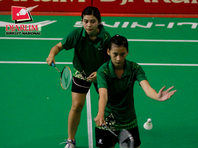 Lana adriana/Maria Natalia (Fokus Badminton Club) mengembalikan serve dari Monika Intan Tutiharta/Tri Okta Shelina (Mutiara Bandung).