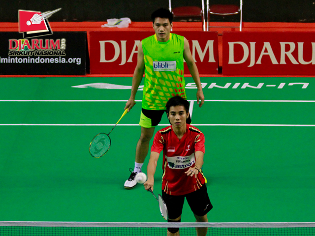 Elham Saptono (Chandra Wijaya) mencoba mengembalikan kok ke arah Hardi Yuda S (Sarwendah BC).