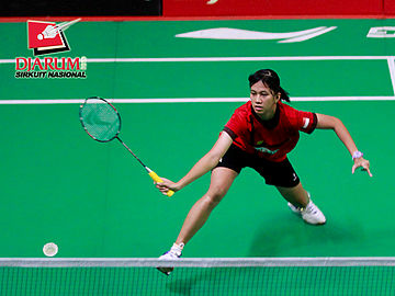 Melisa Andesti (Djarum Kudus) berusaha menggapai kok.