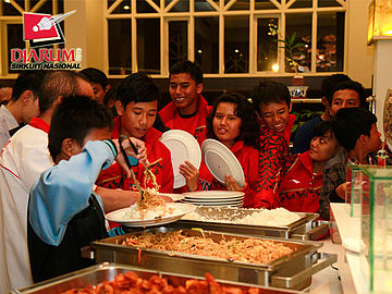 Para pebulutangkis PB Djarum saat berkumpul di depan meja makanan.