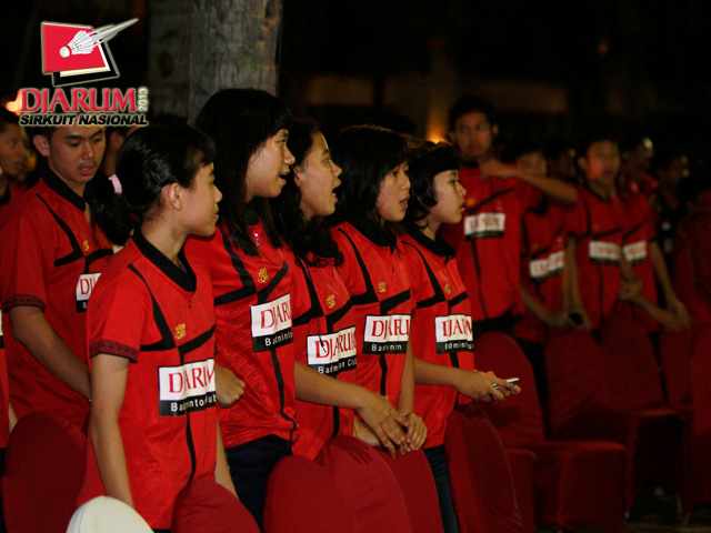 Sejumlah atlet PB Djarum saat menyanyikan lagu Indonesia Raya.