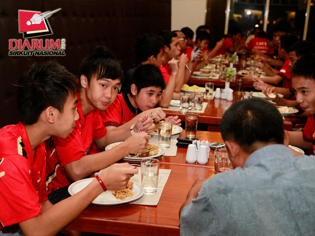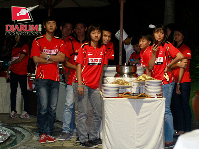 Sejumlah atlet PB Djarum saat santap malam di Pandan Wangi Hotel Sheraton.