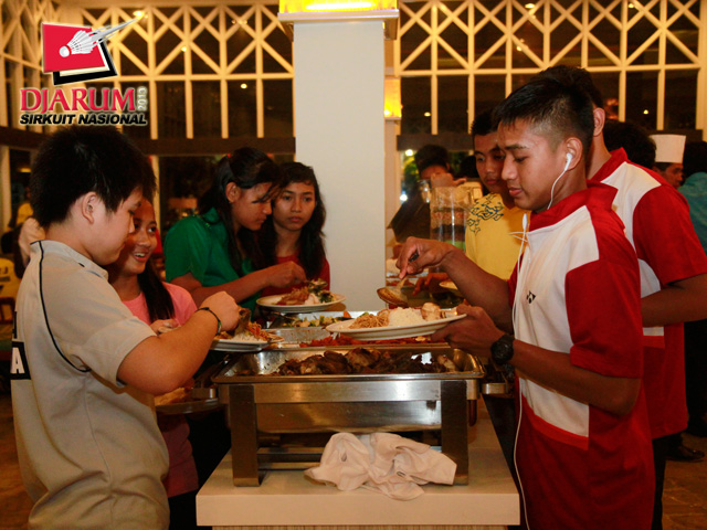 Para atlet PBSI Lampung saat mengantri makanan di Pandan Wangi Hotel Sheraton.