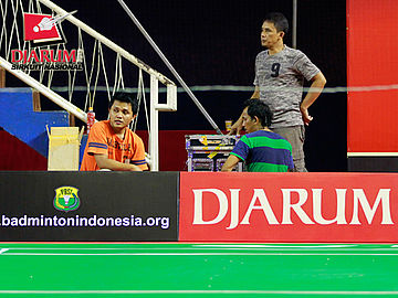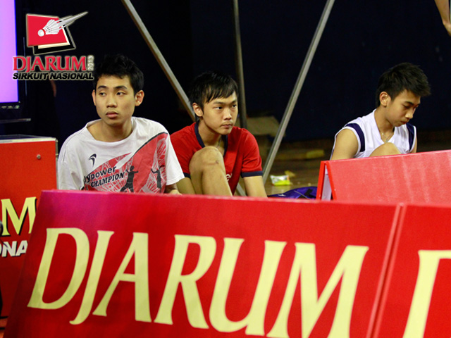 Tiga pebulutangkis PB Djarum sedang bersiap di pinggir lapangan untuk memulai latihan.