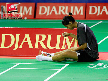 Salah satu atlet SGS PLN saat membetulkan tali sepatunya.